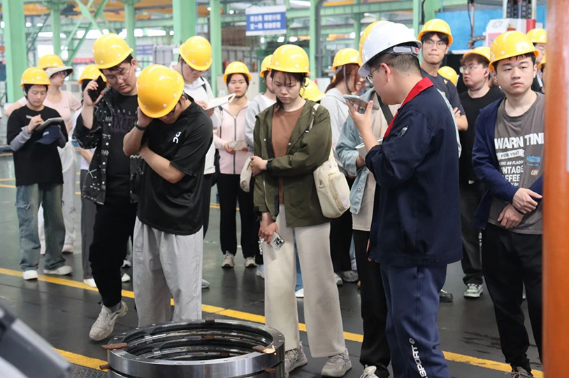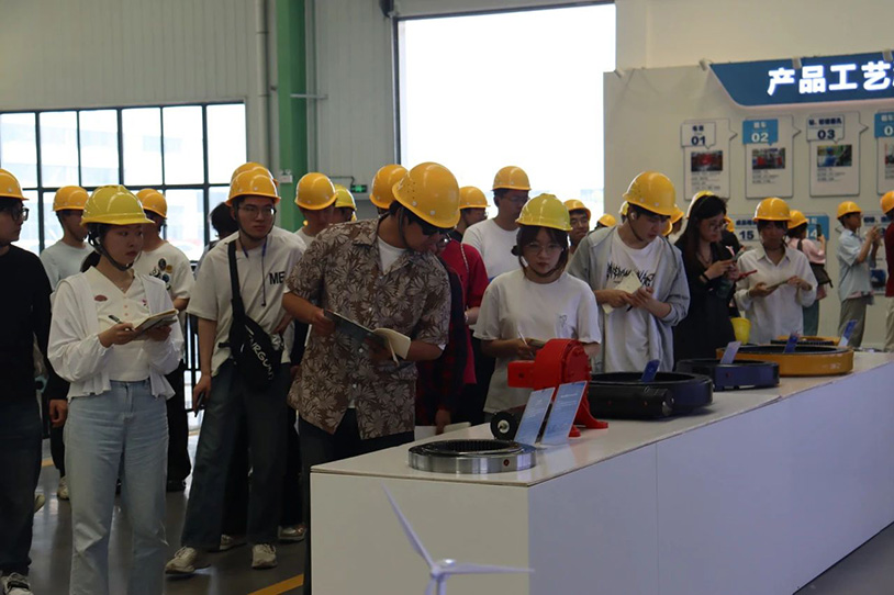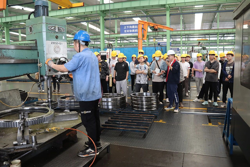 在生產車間,師生們實地觀摩了回轉支承的精密加工、熱處理及裝配全流程。企業(yè)技術骨干結合實際案例,講解了回轉支承在極端工況下的性能要求及質量控制要點,并就材料學、力學性能優(yōu)化等關鍵技術問題與師生展開深入探討。